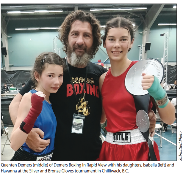 Havanna and Isabella Demers represented Saskatchewan and Demers Boxing of Rapid View at the recent 2025 Silver and Bronze Gloves tournament held in Chilliwack, B.C. Havanna boxed Ruby Coleman of Vancouver B.C.’s Quinnet Boxing Club. Coleman was the current 57-kilogram Junior ‘C’ B.C. provincial champion. She also placed in the top fve at the 2025 Youth and Junior Championships last June in Quebec City. Coleman has been described as a contender with a slick style and could beat anyone on any given night. She is also the daughter of a former pro boxer Chris Coleman.