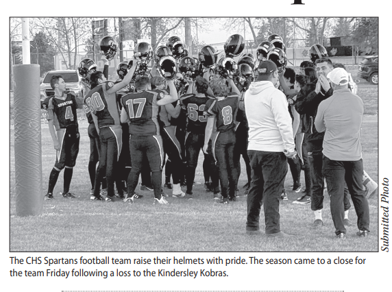 “Caleb Rodrigue had another good game for us, scoring all of our touchdowns,” Ethier said. “This was also the first time our team played an entire game of stop time football, so, although we gave up the same amount of points as last week, it was an improvement for our defence.” Spartans player Evan Klassen got an interception in the second half, with Ethier adding how good it was to see the team’s defence force some more turnovers. “The turnaround from playing a Tuesday game (the Oct. 7 encounter with John Paul II Collegiate) to a Friday game was tough on our team,” Ethier stated. “They don’t even make the pros play the Monday night and Thursday night games.” In spite of this, Ethier acknowledges the strong effort put forth by the athletes and the support the Spartans have received since returning to the field earlier this year. “I just want to say thank you to our athletes for coming out and getting better this season, especially our Grade 12s,” he said. “I also want to say a huge thank you to the community for their continued support.” The Spartans closed out the season with a record of 0-6.