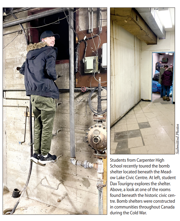 Armed with a borrowed key, a bit of Cold War curiosity and more questions than answers, history students from Meadow Lake’s Carpenter High School recently went searching for the long-talked about bomb shelter beneath the Meadow Lake Civic Centre. Their search led them to uncover a concrete mystery that suggests the nuclear age may have hit closer to home than most people realize. “We’re looking at the Cold War in History 20 and talked about the bomb shelter era and how most communities had a bomb shelter,” explained CHS teacher Derek Eftoda. “Through some calling around and according to urban lore, I heard the old bomb shelter in Meadow Lake was located in the basement of the Civic Centre.” Eftoda then made a call to the City of Meadow Lake to make an official inquiry. “They didn’t have any information, but offered a key to the Civic Centre so my class and I could go and investigate,” Eftoda added.