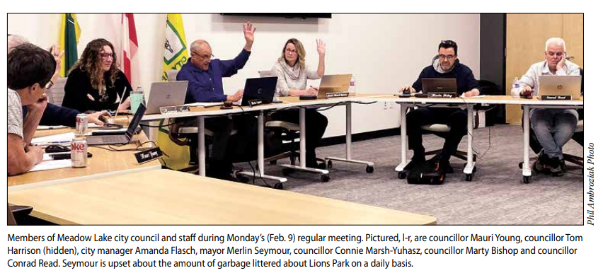 Mayor Merlin Seymour would like to remind the public Lions Park is not a landfill. During the regular meeting of Meadow Lake city council held Monday (Feb. 9), Seymour once again raised an ongoing concern of his – the large amount of litter, trash and debris found floating about Lions Park on a near daily basis. “I’ve received some comments about this and I’ve witnessed it firsthand quite regularly, but I’ve spent the occasional lunch hour at Lions Park and I am disgusted by the amount of garbage in the parking lot on a daily basis,” Seymour said. “I know the parks and recreation staff is tired of picking garbage up. I usually take a zip through there in the mornings on my way to work, and there is always garbage there. One morning I picked up two garbage bags full – food wrappers and all kinds of crap – and then, the next day, there was garbage out there again.” Seymour also confirmed with council the parking area he is referring to is the one located behind the Meadow Lake and District Museum near Assman Field. “There’s often a multitude of vehicles parked there and, while I’m glad people go there to have their lunch, there are frigging garage cans around there,” he said. “If people can’t use them I’m probably going to suggest we either quarantine it (parking lot) off or we have the RCMP and the bylaw department sitting there handing out tickets.”