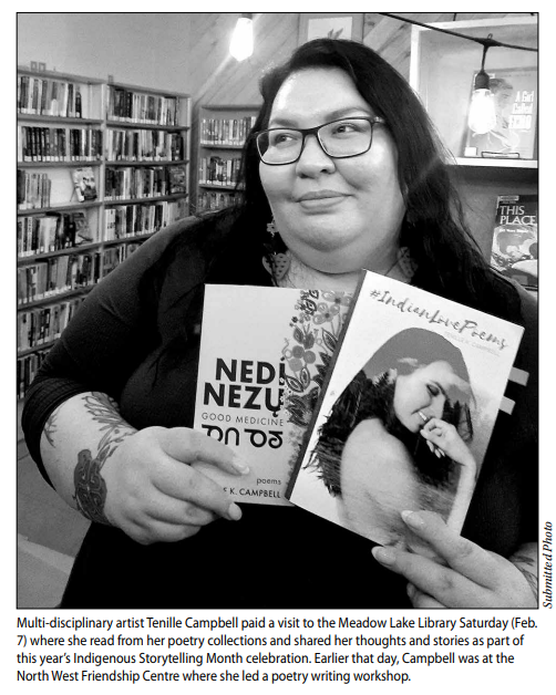 “Libraries across Saskatchewan host First Nations, Métis, and Inuit storytellers, musicians, artists, elders and other skilled individuals to share their knowledge,” explained Tawn Marshall of the Meadow Lake Library. “Last year, Saskatchewan Indigenous Storytelling Month events reached an audience of more than 10,000 people. This year, the Meadow Lake Library partnered with the North West Friendship Centre to bring multi-disciplinary artist Tenille Campbell to Meadow Lake. While these days she spends lots of time on her photography business, Tenille is largely known for her poetry. She published #IndianLovePoems in 2017, followed by Nedi Nezu (Good Medicine) in 2021, with a new collection coming soon.”