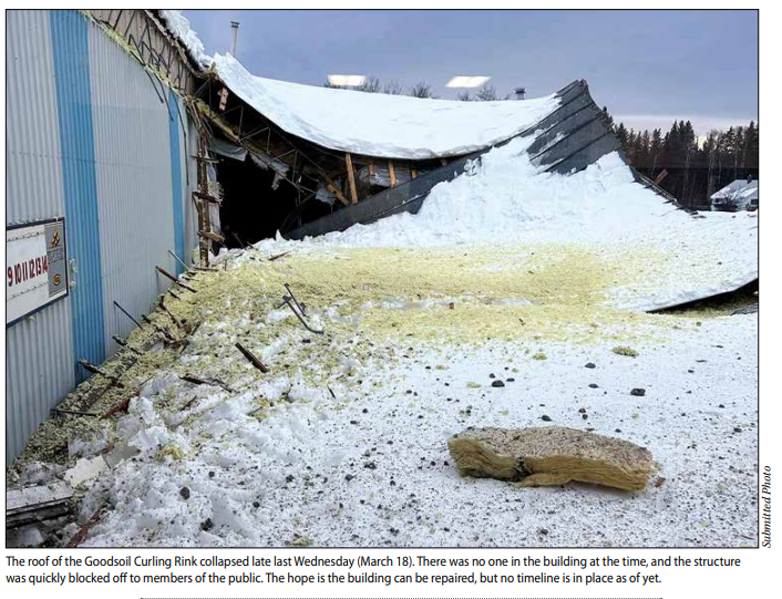 The rink was also a popular venue for Goodsoil and area residents. “The mezzanine portion of the ice hockey side, our last game of the season was there last night (March 18),” Rogers said. “The last person put of the rink was at 9 p.m. and this happened around 10 p.m. They wouldn’t have been in direct danger as they weren’t on the curling surface, but our last curling game was Feb. 28. The curling ice had been shut down for a few weeks, but, still, this could have happened at any time. It makes us a little more aware of some of the ongoing conditions of our building.” And, although Rogers said the long-term plan is to repair the building, he’s uncertain as to how long this will take.